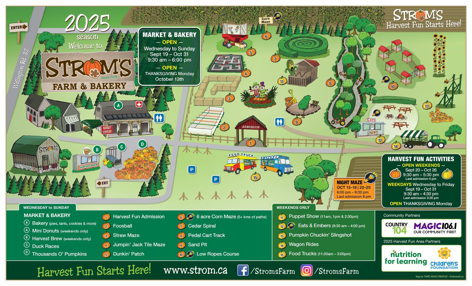 Map is used on website to educate customers and preplan their visit, and on-site as way-finder to all the experiences that Strom’s Farm & Bakery offers.